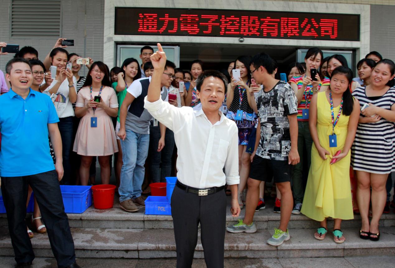 黃總現(xiàn)場點(diǎn)名了TCL移動通訊的呂小斌總、通力電子工廠樓的兄弟姐妹們接受冰桶挑戰(zhàn)。黃總在挑戰(zhàn)前發(fā)表了熱情四溢的講話,他說:“通力正在歷經(jīng)轉(zhuǎn)型,我們需要創(chuàng)新,我很欣賞有這樣的活動,也很高興接受這樣的挑戰(zhàn)。綜合樓這邊已經(jīng)沸騰了,而且我已經(jīng)這么干了,對面樓的兄弟姐妹們,你們自已看著辦吧!